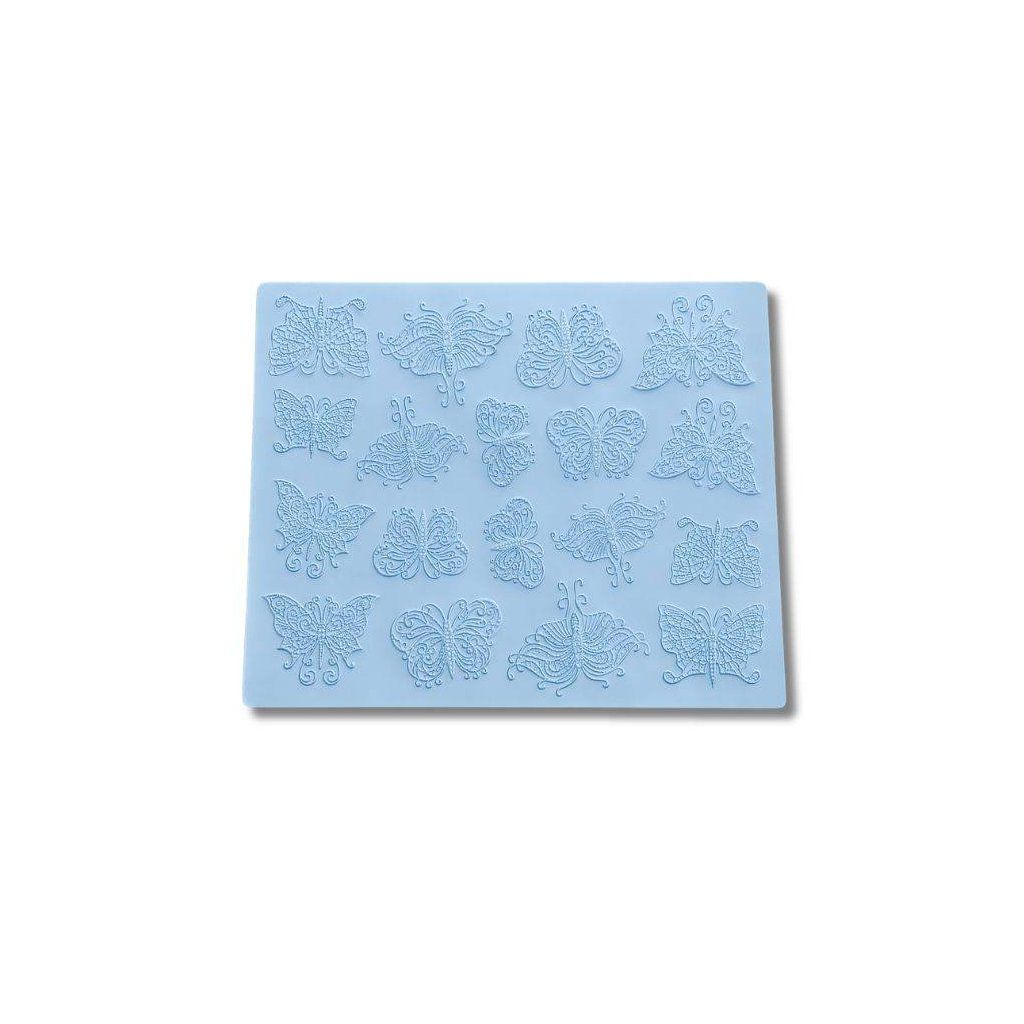 Strukturální silikonový plát se vzorem motýlů je skvělým pomocníkem pro zdobení dortů, sušenek i dalších cukrářských výrobků. Při válení do potahovací hmoty, marcipánu nebo těsta vytváří souvislý reliéf s motivem motýlků, který dodá vašim dezertům jemný a originální vzhled.