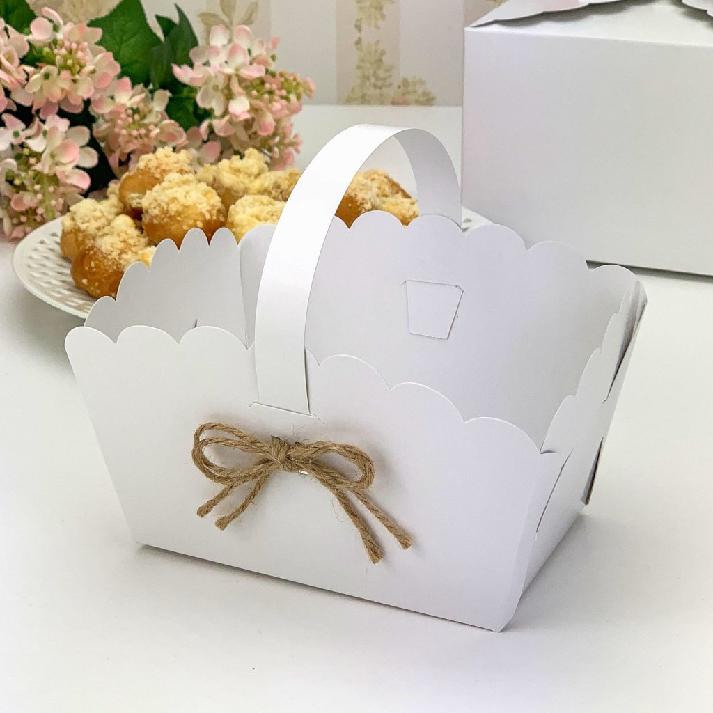 Svatební košíček na cukroví bílý s provázkem (13 x 9 x 9,5 cm) ♡