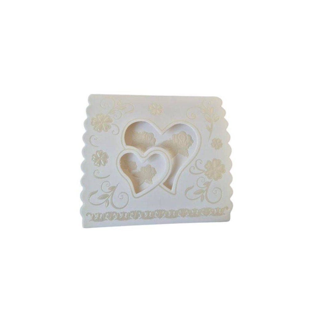Svatební krabička na výslužku bílá s perleťovým vzorem Srdíčka (7,4 x 7,4 x 3,6 cm) ▹