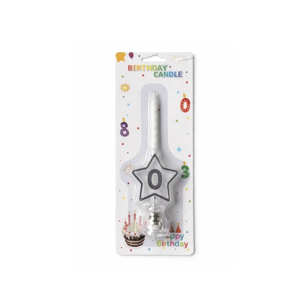Svíčka bílá s LED stříbrným podstavcem ve tvaru hvězdy číslo 0 ▹