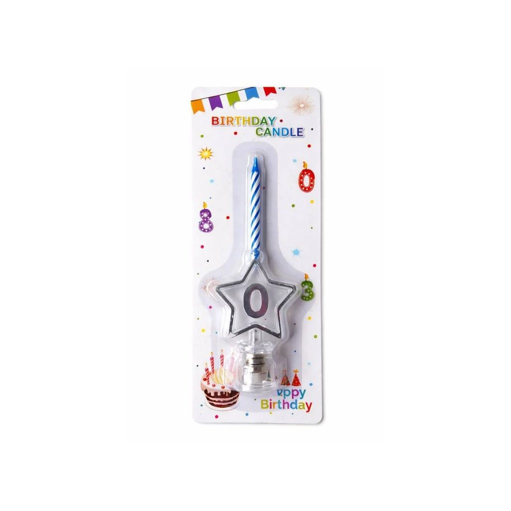 Svíčka modrá s LED stříbrným podstavcem ve tvaru hvězdy číslo 0 ▹