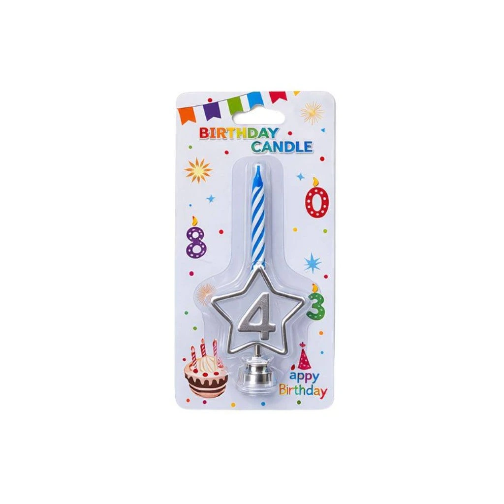 Svíčka modrá s LED stříbrným podstavcem ve tvaru hvězdy číslo 4 ▹