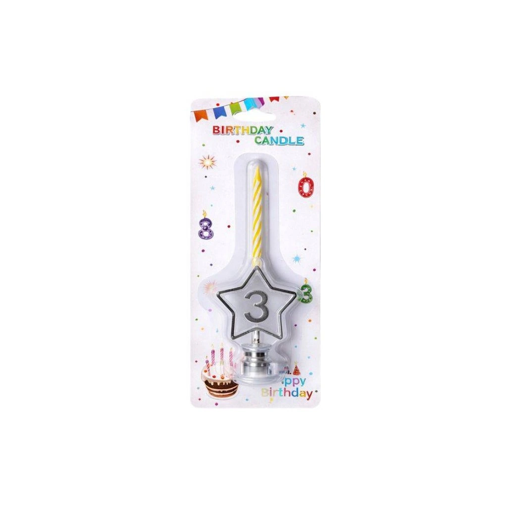 Svíčka žlutá s LED stříbrným podstavcem ve tvaru hvězdy číslo 3 ▹