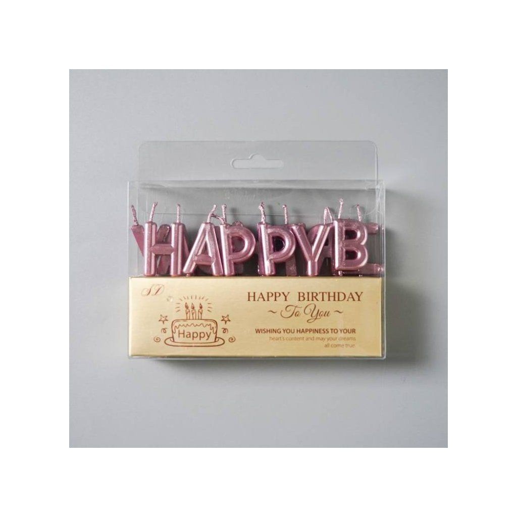 Narozeninové svíčky na dort ve tvaru nápisu Happy Birthday.