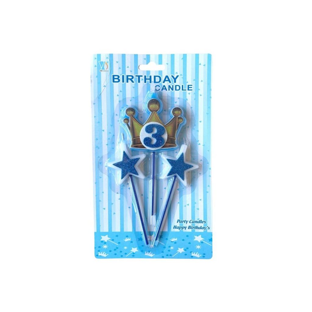 Slavnostní sada narozeninových svíček obsahuje jednu dekorativní svíčku ve tvaru koruny s číslem a dvě doplňkové hvězdičkové svíčky. Skvěle ozdobí narozeninový dort a vytvoří elegantní, pohádkovou atmosféru. Ideální pro dětské oslavy, tematické párty i jako stylový doplněk k dortům všech typů.