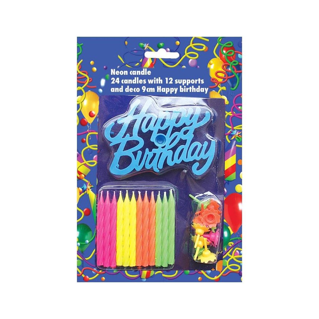 Narozeninové svíčky na dort neonové, s nápisem Happy Birthday. 24 ks balení.Doplňkové parametry