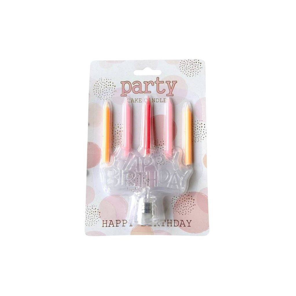 Svíčky oranžové, růžové a červená s LED nápisem Happy Birthday ▹