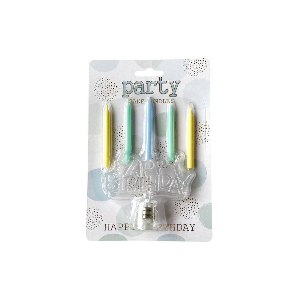 Svíčky žluté, zelené a modrá s LED nápisem Happy Birthday ▹