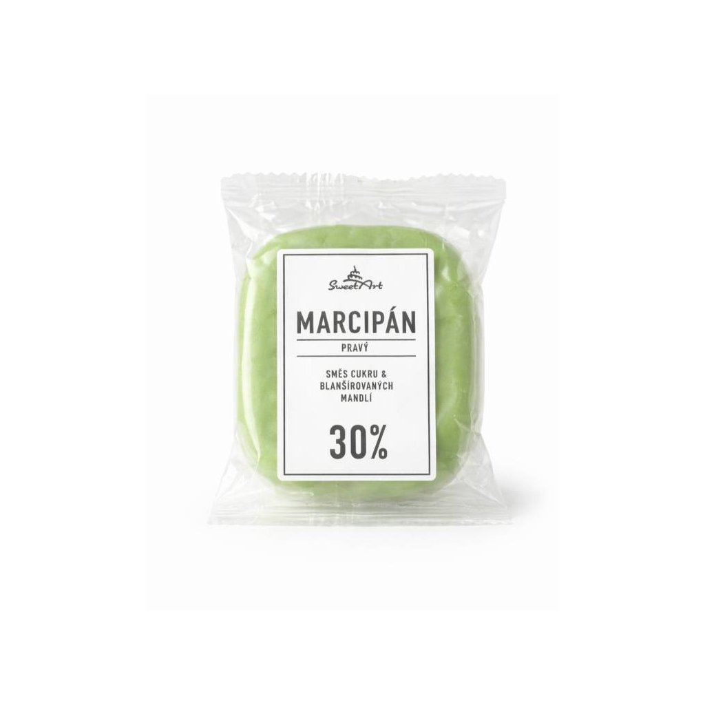 Složení, co obsahuje produkt - SweetArt Pravý marcipán světle zelený 30% mandlí 150 g pro cukrářské účely: