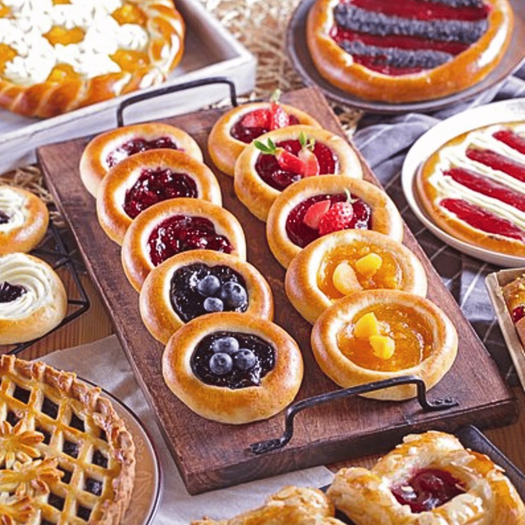 Má lesklý vzhled náplně a viditelné kousky ovoce dodají pečivu na přitažlivosti.