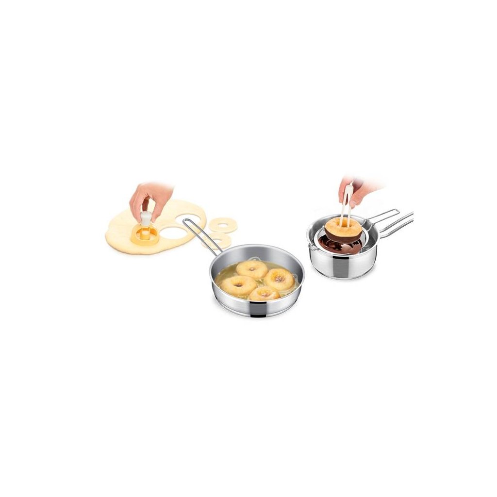 Vynikající pro snadnou přípravu domácích donutů. Pomocí tvořítka vykrojte z těsta donuty, usmažte je v oleji a pomocí kleští namočte v polevě. Vyrobeno z prvotřídního odolného plastu, vhodné do myčky. Namáčecí kleště nepoužívejte pro manipulaci s donuty během smažení! Průměr: 8 cm Délka kleští: 11 cmDoplňkové parametry