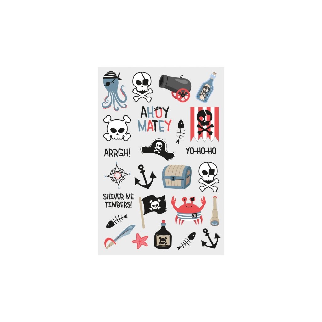 Sada 25 kusů pirátských krátkodobých tetování na jednom tetovacím papíře. Jednoduše vystřihnete obrázek, přitisknete na kůži, přiložíte mokrou houbu a za chvilku je tetování hotové. Rozměry: 14 x 21 cmMateriál: Papír, Acrylaten/VA copolymeer a vodaBalení: 1 ksObchodní balení: AnoDoplňkové parametry