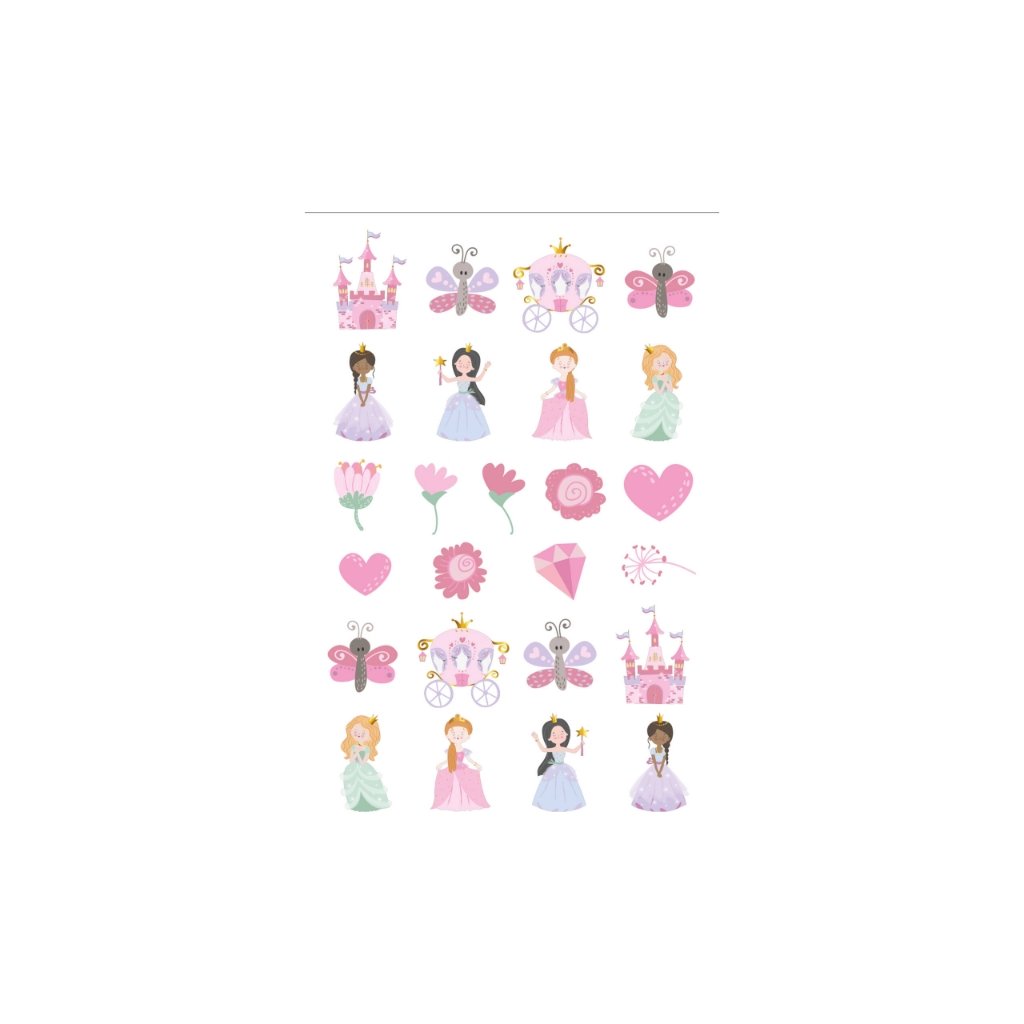 Sada 25 kusů princeznovských krátkodobých tetování na jednom tetovacím papíře. Jednoduše vystřihnete obrázek, přitisknete na kůži, přiložíte mokrou houbu a za chvilku je tetování hotové. Rozměry: 14 x 21 cmMateriál: Papír, Acrylaten/VA copolymeer a vodaBalení: 1 ksObchodní balení: AnoDoplňkové parametry