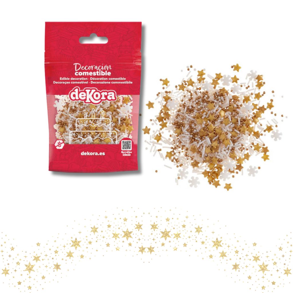 Dekora cukrové zdobení Sněhové vločky bílé a hvězdičky zlaté (100 g) ♡
