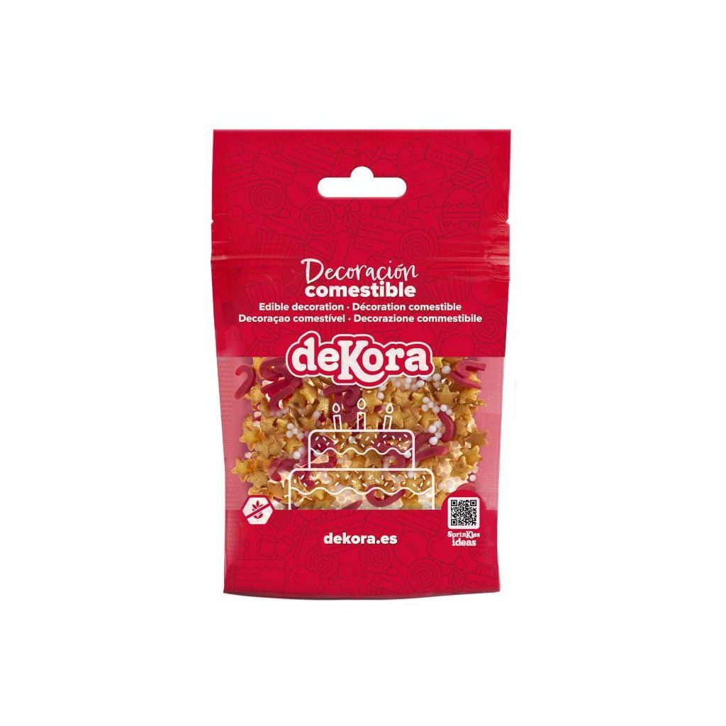 Složení, co obsahuje produkt - Dekora cukrové zdobení Hvězdičky zlaté a hůlky červené 100 g pro cukrářské účely: