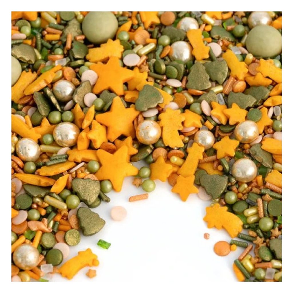 Tento dekorativní mix přináší hvězdnou podívanou přímo do vaší kuchyně. Každé balení je plné zlatých hvězdiček a lesklých komet, které přinášejí jiskřičku radosti na každý vánoční stůl. Stromečky v různých odstínech zelené s drobnými zlatými kuličkami spolu s čokoládovými perličkami plnými olivově zelené barvy vytvoří harmonii chutí, která ohromí každého gurmána.
