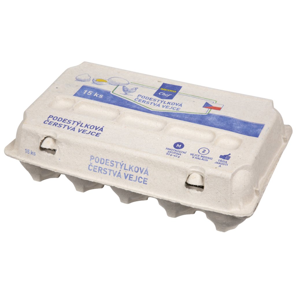 - čerstvá vejce nosnic v halách, 15 ks, jakostní třída A, hmotnostní skupina M(53-63g)