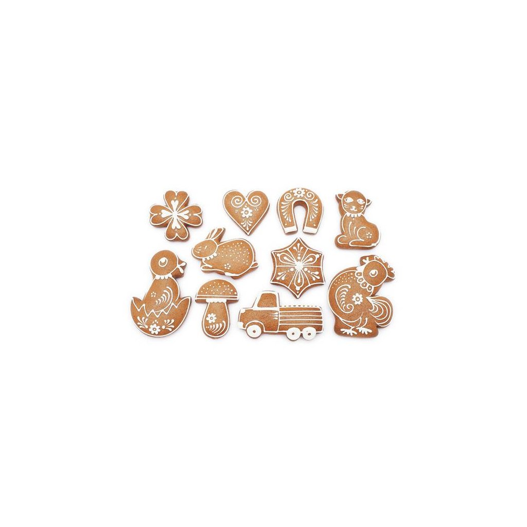 Vykrajovačky jsou zhotoveny ze zdravotně nezávadného a dostatečně odolného pocínovaného plechu, horní okraj je pro lepší udržení tvaru i bezpečnost při práci s nimi přehnut a tím zdvojen, takže tvoří oblou hranu. Mezi motivy najdete například podkovu pro štěstí, autíčko, letadlo, hříbek, motýla, miminko v zavinovačce, vějíř, trojlístek, srdíčko z lásky, květ nebo vzor s lístky. Výsledné tvary budou střední velikosti, použitelné samostatně jako zákusky nebo přílohy ke kávě či čaji, lze je ale použít i při zdobení dortů nebo jiného svátečního pečiva.