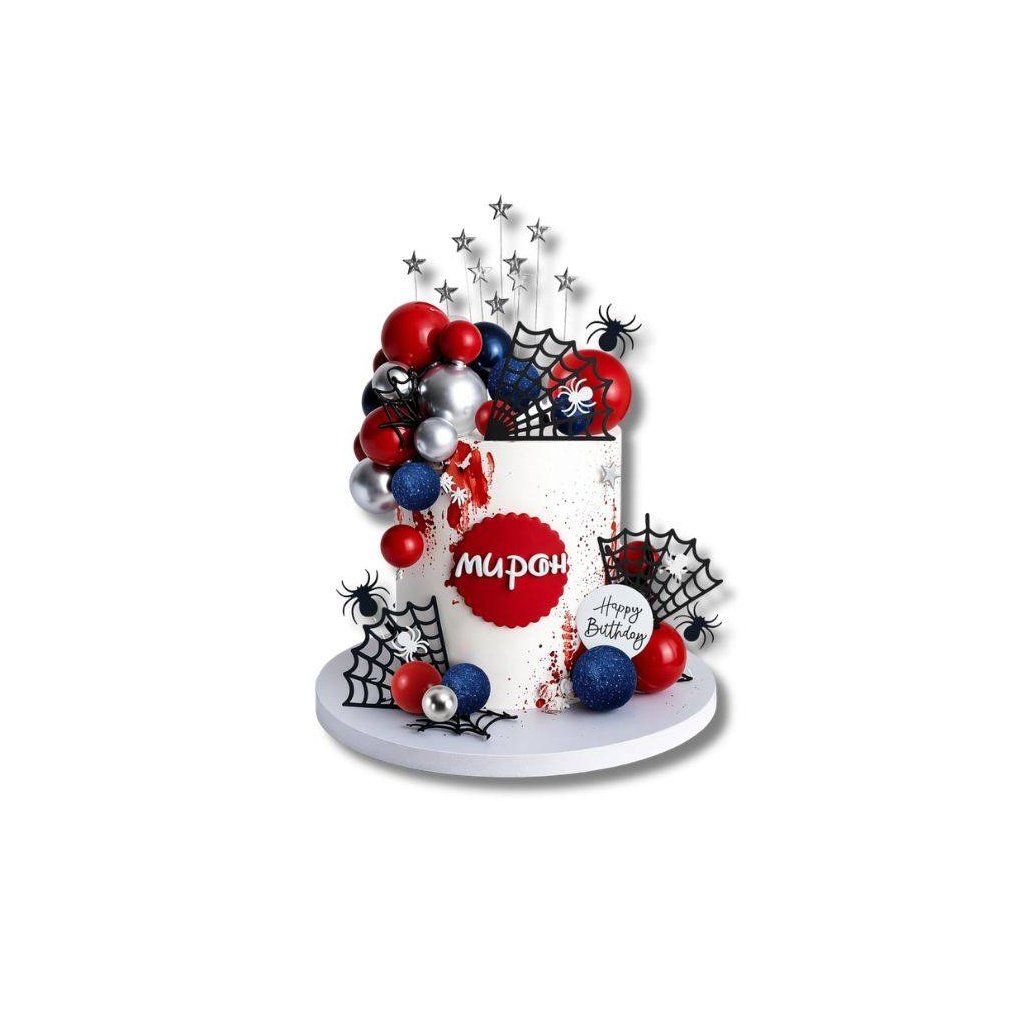 Vytvořte originální narozeninový dort s lehce tajemnou atmosférou díky dekoraci Happy Birthday s pavoučím motivem. Kombinace pavučinového designu a dekorativních koulí dodá dortu výrazný a zábavný vzhled, který se skvěle hodí na tematické oslavy nebo dětské party.