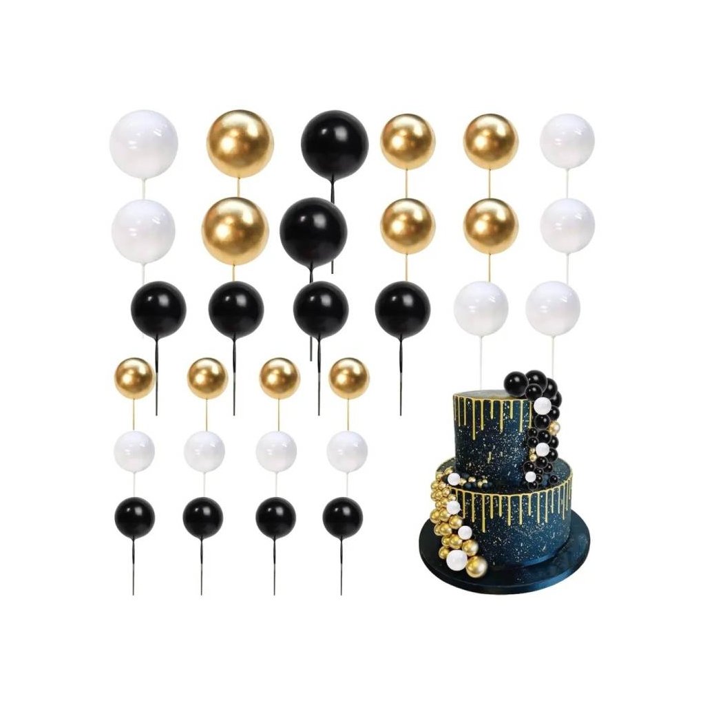 Zápich do dortu Koule bílé, černé a zlaté různé velikosti (36 ks) ▹