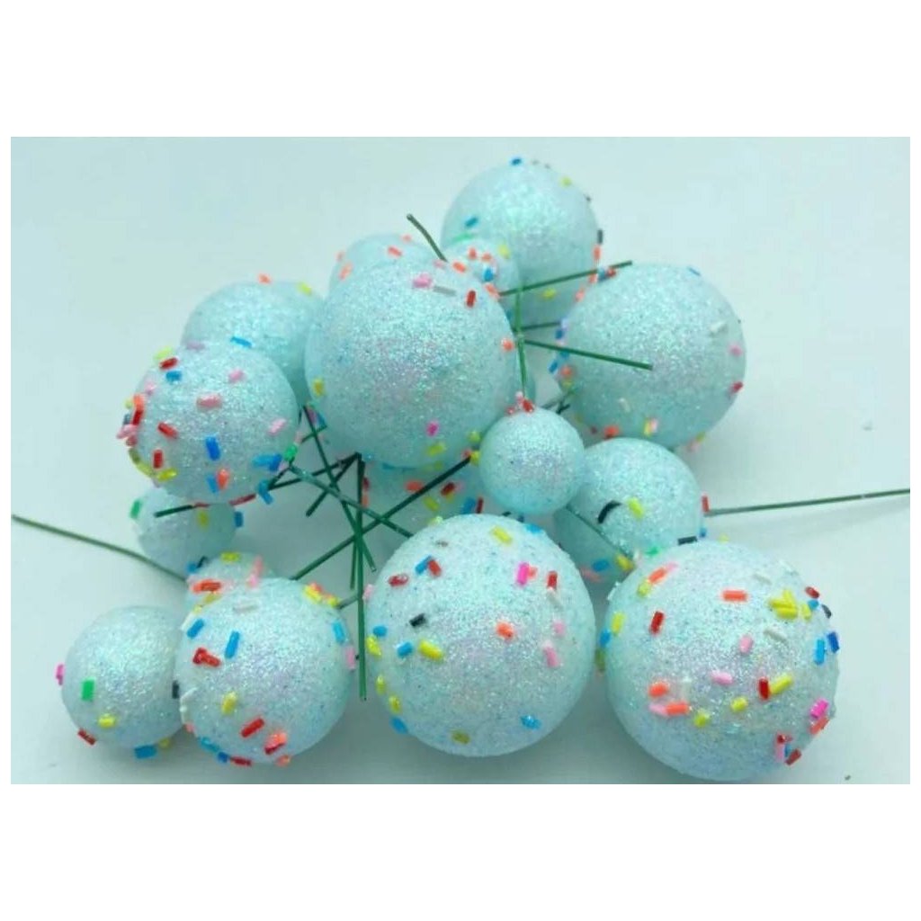 Zápich do dortu Koule světle modré glitterové s ozdobami různé velikosti (20 ks) ▹