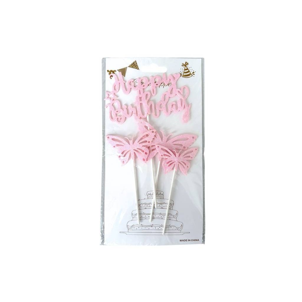 Zkrášlete narozeninový dort půvabnou sadou 4 dekorativních zápichů, která obsahuje 1 zápich s nápisem „Happy Birthday“ a 3 samostatné zápichy motýlků. Jemné růžové provedení a elegantní motivy vytvářejí romantickou a slavnostní atmosféru, ideální pro dívčí oslavy či elegantní narozeninové dorty.