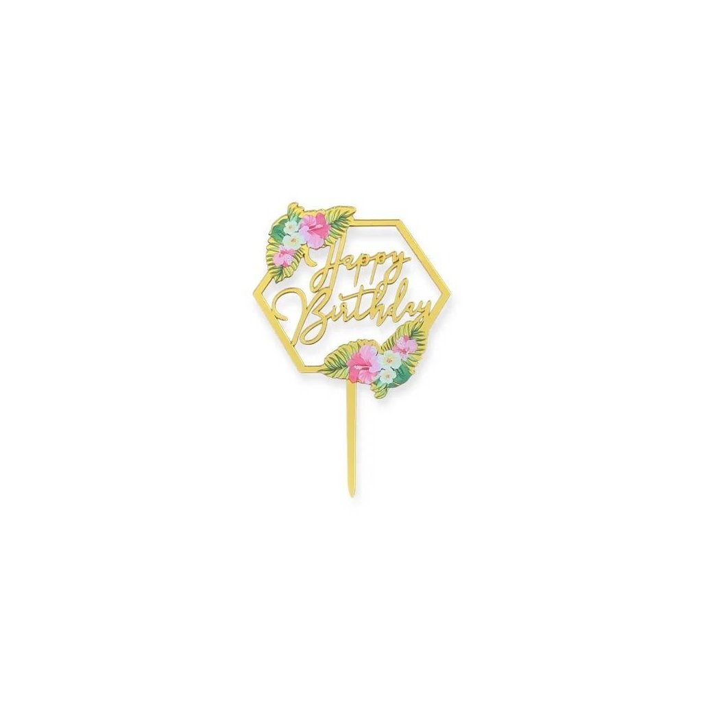 Zápich do dortu zlatý Happy Birthday v rámečku s květinami ♡
