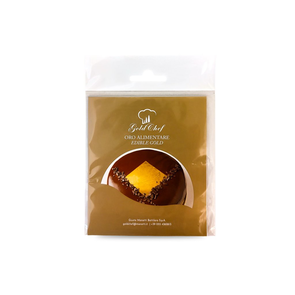 Plátek jedlého zlata 22 karátů o velikosti 80 x 80 mm. Vhodné k přímému použití jako dekorace cukrářských a pekařských výrobků.