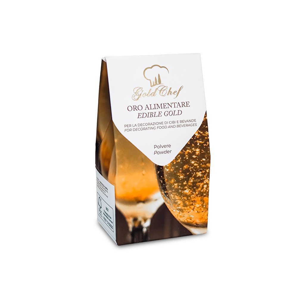 Jedlé zlato v prášku. Díky své třpytivosti je prášek ideální jako dekorace do nápojů (šampaňské), na slavnostní dezerty a první chody, nebo v cukrářské a pekařské výrobě.